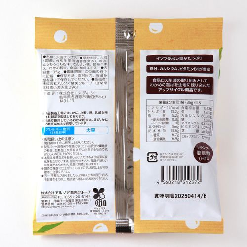 | 栄養成分 1袋当り | エネルギー:140kcal たんぱく質: 13.2g 脂質: 5.2g -飽和脂肪酸:0.8g -トランス脂肪酸:0g コレステロール:0mg 炭水化物:13.6g -糖質:6.7g -食物繊維:6.9g 食塩相当量:0.13g 大豆イソフラボン:126mg |