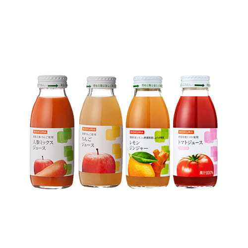 ストレートジュース4種類(国産100%人参ミックスジュース、トマトジュース、リンゴジュース、レモンジンジャー)